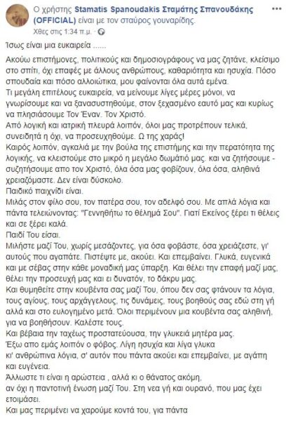 Επίκαιρο μήνυμα του μουσικοσυνθέτη Σταμάτη Σπανουδάκη, επ’ αφορμή της εξαπλώσεως του ιού του κορονοϊού και τη λήψη έκτακτων μέτρων εκ μέρους της Πολιτείας, όπου, καθώς αναφέρει: