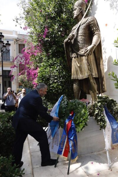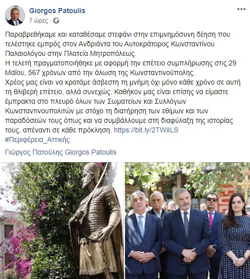 “Παραβρεθήκαμε και καταθέσαμε στεφάνι στην επιμνημόσυνη δέηση που τελέστηκε εμπρός στον Ανδριάντα του Αυτοκράτορος Κωνσταντίνου Παλαιολόγου στην Πλατεία Μητροπόλεως” αναφέρει σε επίκαιρη ανάρτησή του, ο Περιφερειάρχης Αττικής κ. Γιώργος Πατούλης. “Η τελετή πραγματοποιήθηκε με αφορμή την επέτειο συμπλήρωσης στις 29 Μαΐου, 567 χρόνων από την άλωση της Κωνσταντινούπολης. Χρέος μας είναι να κρατάμε άσβεστη τη μνήμη όχι μόνο κάθε χρόνο σε αυτή τη θλιβερή επέτειο, αλλά συνεχώς. Καθήκον μας είναι επίσης να είμαστε έμπρακτα στο πλευρό όλων των Σωματείων και Συλλόγων Κωνσταντινουπολιτών με στόχο τη διατήρηση των εθίμων και των παραδόσεών τους όπως και να συμβάλλουμε στη διαφύλαξη της ιστορίας τους, απέναντι σε κάθε πρόκληση”.