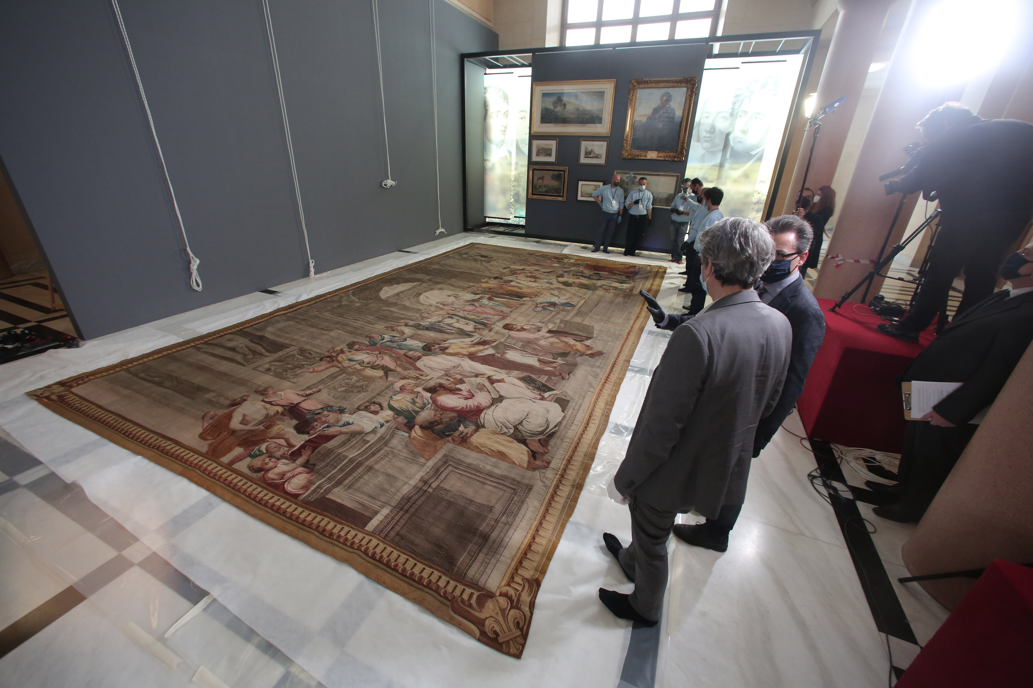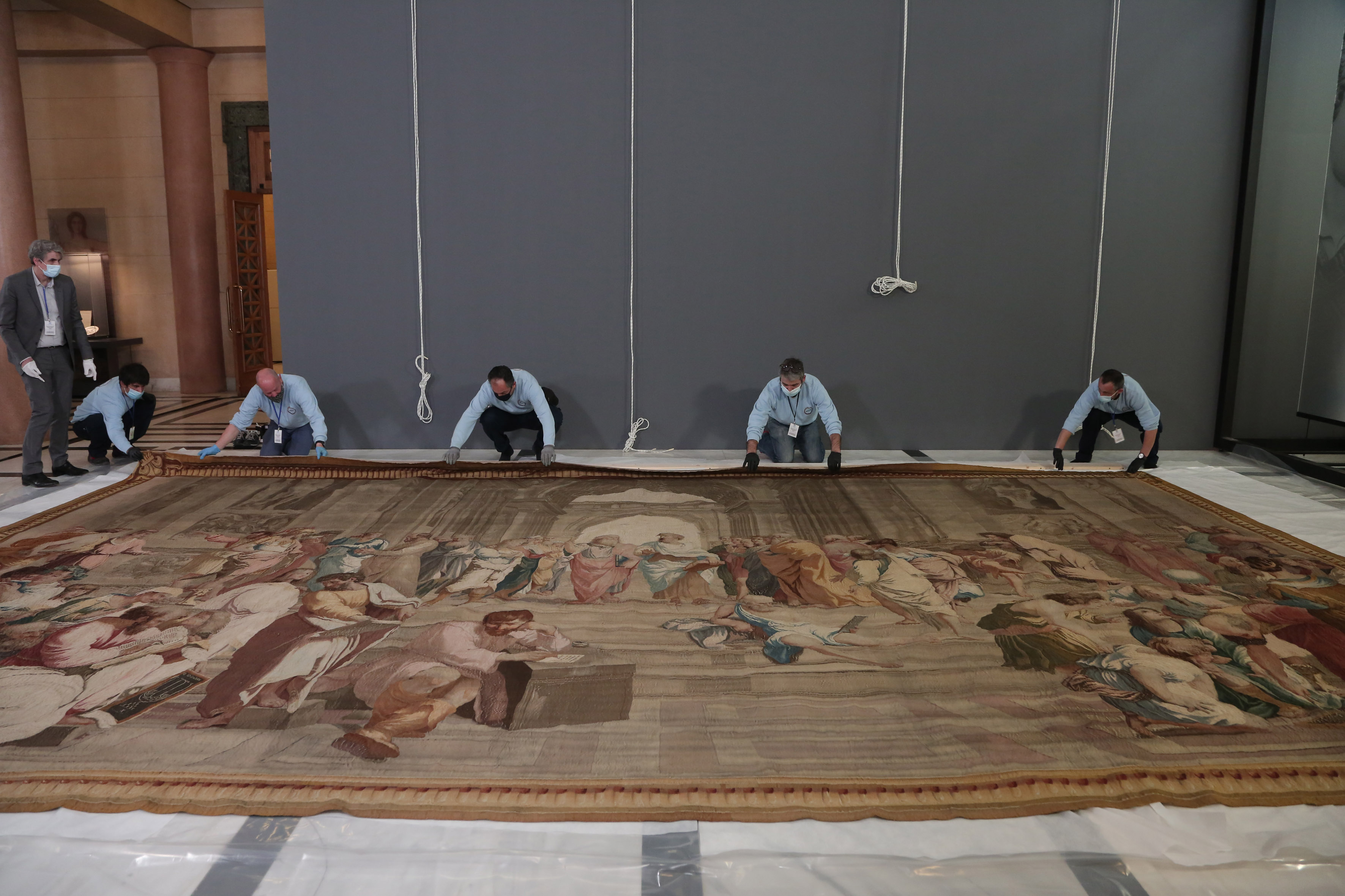 Όπως σημείωσε ο Πρόεδρος της Βουλής, είναι η πρώτη φορά από τότε που κατασκευάστηκε, το 1775, από το περίφημο εργοστάσιο Γκομπλέν στο Παρίσι, που ο συγκεκριμένος τοιχοτάπητας φεύγει από τη Γαλλία, αλλά «επιστρέφει στην Αθήνα, στην πόλη τη Σχολή της οποίας με τόση καλλιτεχνική έμφαση αποδίδει».
