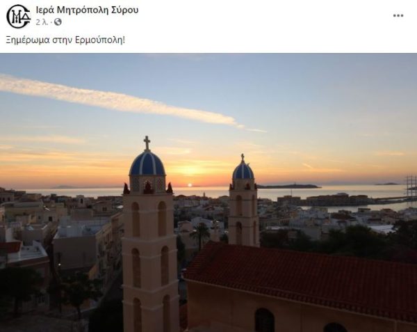 Επικαιρότητα 25 Οκτωβρίου, 2020 ΣΤΙΓΜΙΟΤΥΠΟ “ΟΡΘΟΔΟΞΙΑ”: Ξημέρωμα στην Ερμούπολη! Διαδώστε: “Ξημέρωμα στην Ερμούπολη!” αναφέρει η Ιερά Μητρόπολη Σύρου, δημοσιεύοντας το ως άνω φωτογραφικό στιγμιότυπο στα κοινωνικά δίκτυα, κατά την Κυραική 25η Οκτωβρίου. Τα χρώματα μιλούν απο μόνα τους και μία ακόμη ευλογημένη Κυριακή εκκινεί. Διαδώστε:
