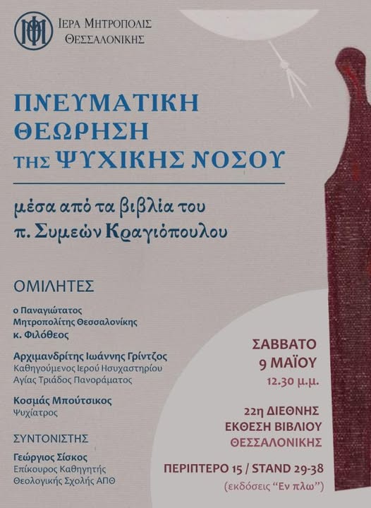 29/04/2026 29/04/2026 Εκδήλωση με θέμα: «Πνευματική θεώρηση της ψυχικής νόσου, μέσα από τα βιβλία του π. Συμεών Κραγιόπουλου» θα πραγματοποιηθεί το Σάββατο 9 Μαΐου 2026 στις 12.30, στο πλαίσιο της 22ης Διεθνούς Έκθεσης Βιβλίου Θεσσαλονίκης. Η εκδήλωη θα πραγματοποιηθεί στο περίπτερο 15 / stand 29-38 των εκδόσεων «Εν πλω» με ομιλητές: Παναγιώτατος Μητροπολίτης Θεσσαλονίκης κ. Φιλόθεος Αρχιμανδρίτης...