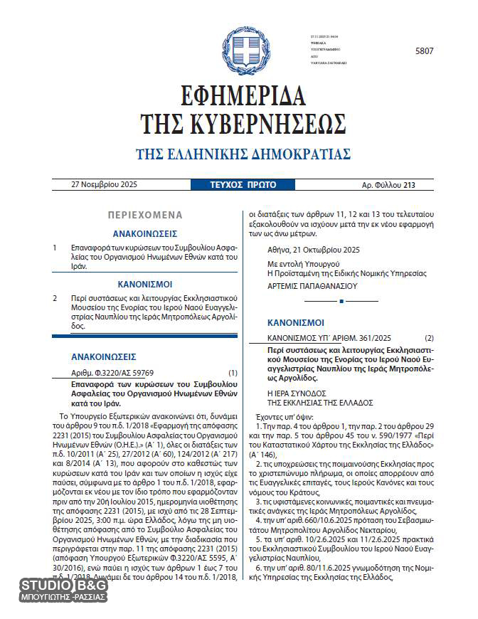 Με ιδιαίτερη χαρά και ευγνωμοσύνη προς τον Θεό, ανακοινώνεται ότι, κατόπιν αποφάσεως της Διαρκούς Ιεράς Συνόδου και εγκρίσεως της Ιεράς Συνόδου της Ιεραρχίας της Εκκλησίας της Ελλάδος, κατά την συνεδρία της 7ης Οκτωβρίου 2025, δημοσιεύθηκε στο Φύλλο Εφημερίδος της Κυβερνήσεως (ΦΕΚ /Α΄/ 213/ 27.11.2025) ο Κανονισμός «Περί συστάσεως και λειτουργίας του Εκκλησιαστικού Μουσείου της Ενορίας του Ιερού Ναού Ευαγγελιστρίας Ναυπλίου της Ιεράς Μητροπόλεως Αργολίδος».