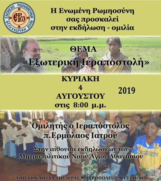 Τὴν Κυριακὴ 4 Αὐγούστου πραγματοποιήθηκε ἐκδήλωση τῆς Ἑνωμένης Ρωμηοσύνης Μυτιλήνης μὲ θέμα “Ἐξωτερικὴ Ἱεραποστολή”, στὴν αἴθουσα ἐκδηλώσεων τοῦ Μητροπολιτικοῦ Ναοῦ Μυτιλήνης, μὲ τὴν εὐλογία τοῦ Σεβασμιωτάτου Μητροπολίτου Μυτιλήνης, κ. Ἰακώβου.