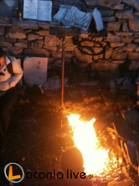 Με το σούρουπο αρχίζει η προετοιμασία για το άναμμα των δύο εστιών, μια προς την πλευρά της Λακωνίας και μια προς εκείνη της Μεσσηνίας. Οι φωτιές, που είναι ορατές σε όλο το νομό, συντηρούνται όλη σχεδόν τη νύχτα και ανάβουν με μισολιωμένα κεριά και λιβάνι που φέρνουν οι προσκυνητές.