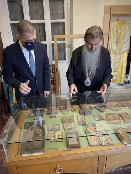 Το πρωί της Δευτέρας παρέστη στη Θεία Λειτουργία στον Ιερό Ναό Κοιμήσεως της Θεοτόκου, στην Αγιάσο και συναντήθηκε με τον Μητροπολίτη Μυτιλήνης, Ερεσσού και Πλωμαρίου κ. Ιάκωβο, με τον οποίο επισκέφθηκαν το εκκλησιαστικό Μουσείο του Ιερού Προσκυνήματος Παναγίας Αγιάσου.