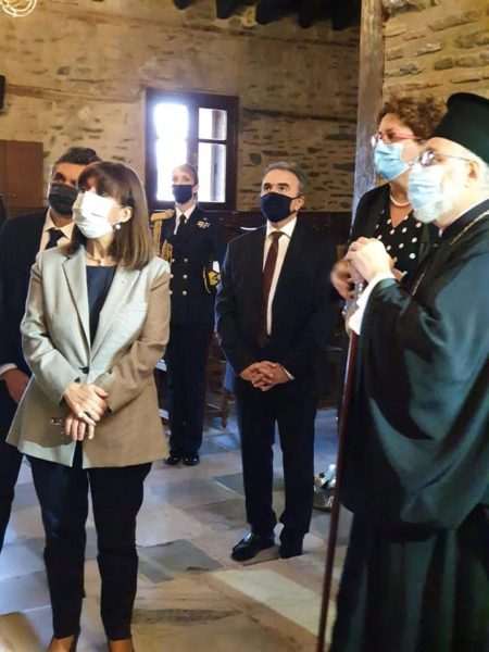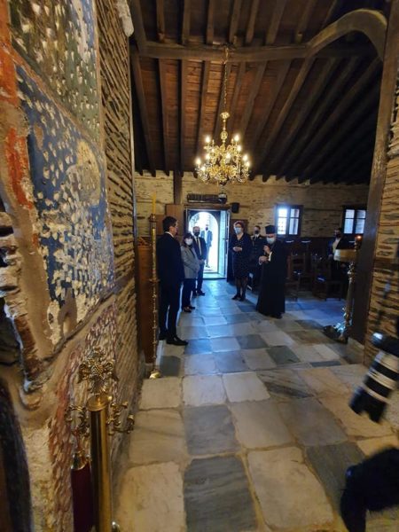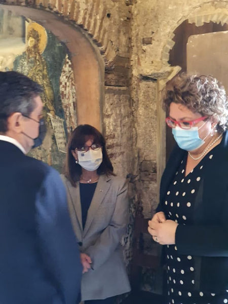 Την Πρόεδρο υποδέχθηκε ο Θεοφιλέστατος Επίσκοπος Αμορίου κ. Νικηφόρος, ηγούμενος της Μονής και Πρόεδρος του ΠΙΠΜ και της επέδωσε το χρυσό μετάλλιο της Μονής και τον κατάλογο της έκθεσης “Ημέτερον Κάλλος. Βυζαντινές Εικόνες από τη Θεσσαλονίκη”, ενώ ο Διευθυντής, καθηγητής Συμεών Πασχαλίδης την ενημέρωσε για τις δράσεις του Ιδρύματος.