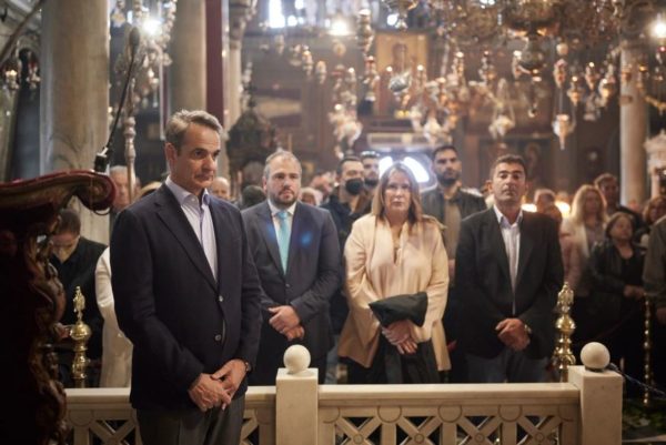 Χθες το βράδυ ο Κυριάκος Μητσοτάκης, συνοδευόμενος από τη σύζυγό του Μαρέβα Γκραμπόφσκι, παρακολούθησε την Ακολουθία και Περιφορά του Επιταφίου, στον Ιερό Ναό Ευαγγελιστρίας
