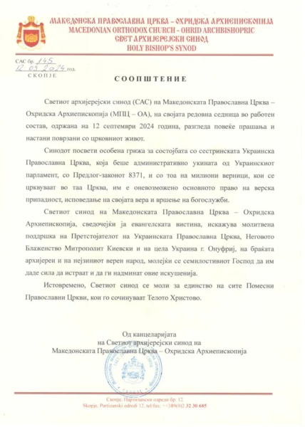 “Η Ιερά Σύνοδος της Μακεδονικής Ορθόδοξης Εκκλησίας – Αρχιεπισκοπή Οχρίδας, μαρτυρώντας την ευαγγελική αλήθεια, εκφράζει με προσευχή τη συμπαράστασή της στον Προκαθήμενο της Ορθόδοξης Εκκλησίας της Ουκρανίας, Μακαριώτατο Μητροπολίτη Κιέβου και πάσης Ουκρανίας κ.κ. Ονούφριο, στους αδελφούς επισκόπους και στον πιστό λαό της, προσευχόμενος να τους δώσει ο πολυέλεος Κύριος τη δύναμη να υπομείνουν και να νικήσουν αυτές τις δοκιμασίες”, καταλήγει η αναφορά στήριξης προς την Ουκρανική Εκκλησία.