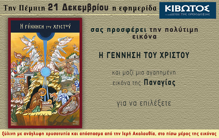 Την Πέμπτη 21 Δεκεμβρίου η εφημερίδα Κιβωτός της Ορθοδοξίας για τις Άγιες μέρες των Χριστουγέννων σας προσφέρει την υπέροχη εικόνα Η ΓΕΝΝΗΣΗ ΤΟΥ ΧΡΙΣΤΟΥ πιστό αντίγραφο έργου της Αγιογράφου Κατερίνας Χαραλαμποπούλου