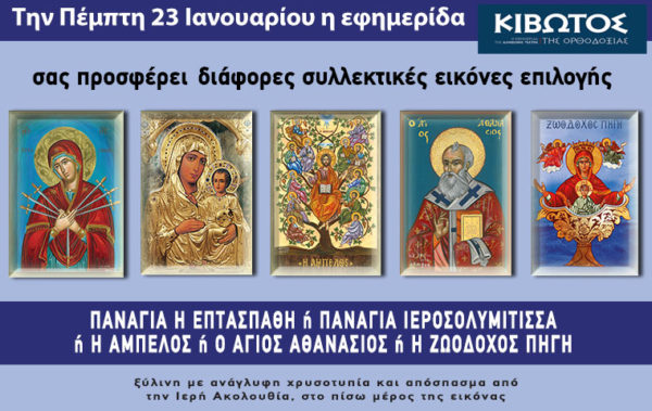 Την Πέμπτη 23 Ιανουαρίου η εφημερίδα «Κιβωτός της Ορθοδοξίας» σας προσφέρει αγαπημένες εικόνες για να επιλέξετε.