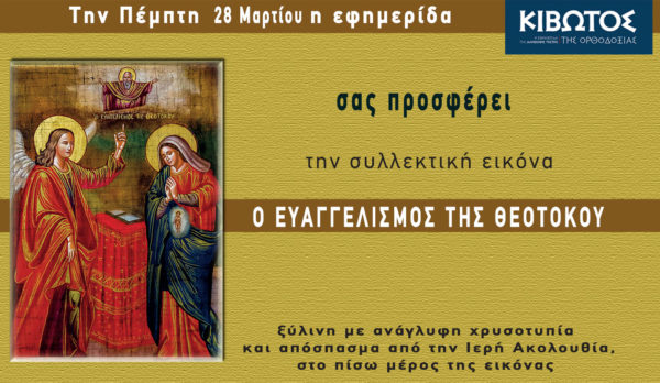 Την Πέμπτη 28 Μαρτίου 2024 η εφημερίδα «Κιβωτός της Ορθοδοξίας» κατόπιν μεγάλης ζήτησης, επανακυκλοφορεί την πολύτιμη εικόνα «Ο Ευαγγελισμός της Θεοτόκου».