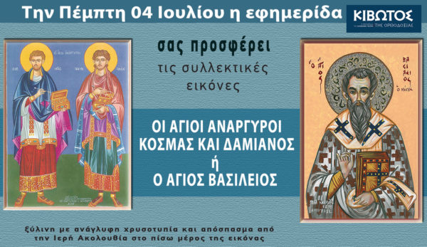 02/07/2024 02/07/2024 Την Πέμπτη, 4 Ιουλίου 2024, κυκλοφορεί το νέο φύλλο της Εφημερίδας «Κιβωτός της Ορθοδοξίας» Την Πέμπτη 4 Ιουλίου η εφημερίδα Κιβωτός της Ορθοδοξίας σας προσφέρει δυο πολύτιμες εικόνες για να επιλέξετε   ΟΙ ΑΓΙΟΙ ΑΝΑΡΓΥΡΟΙ ΚΟΣΜΑΣ & ΔΑΜΙΑΝΟΣ Δια χειρών  Ιωάννας Καραδημήτρη & Ευαγγελίας Δελαπόρτα   Ἅγιοι Ἀνάργυροι καὶ θαυματουργοί,ἐπισκέψασθε τὰς ἀσθενείας ἡμῶν, δωρεὰν ἐλάβετε,...