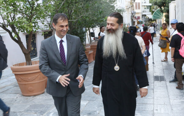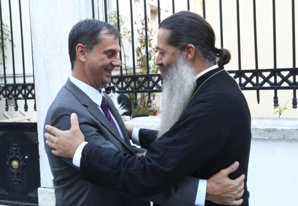 Τον κ. Θεοχάρη είχε υποδεχθεί εγκάρδια ο Επίσκοπος Θεσπιών και Πρωτοσύγκελλος της Ιεράς Αρχιεπισκοπής κ. Συμεών στον αύλειο χώρο της Ιεράς Αρχιεπισκοπής.