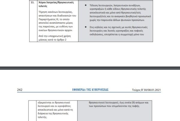 Συγκεκριμένα, για τους χώρους λατρείας δεν ισχύει κάτι νεότερο από τα συνηθισμένα καθώς απαγορεύεται η παρουσία πιστών κατά τη διάρκεια τέλεσης των ιερών ακολουθιών, ενώ θα είναι ελεύθερη η προσέλευση στους ναούς στο πλαίσιο άλλης μετακίνησης.