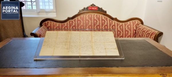 Η ηγουμένη Τιμοθέη ξεκίνησε την παρουσίαση από το γραφείο του Αγίου. “Ατόφιο” το χαρακτήρισε, όπως το είχε στη Ριζάρειο, όπου δίδασκε. Όταν ήρθε στην Αίγινα το έφερε μαζί του. Πάνω σ’ αυτό είναι τοποθετημένη η διαθήκη του που είναι η χειρόγραφη. Οι επισκέπτες μπορούν να βλέπουν τα γράμματα και τον καλλιγραφικό του χαρακτήρα.
