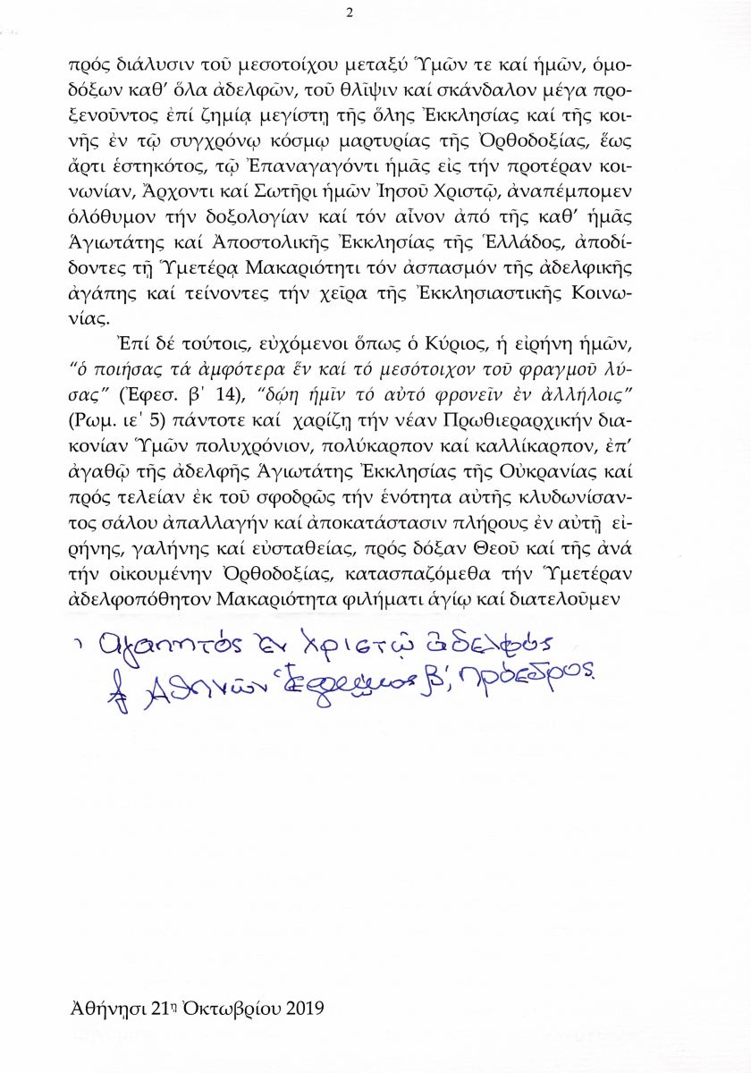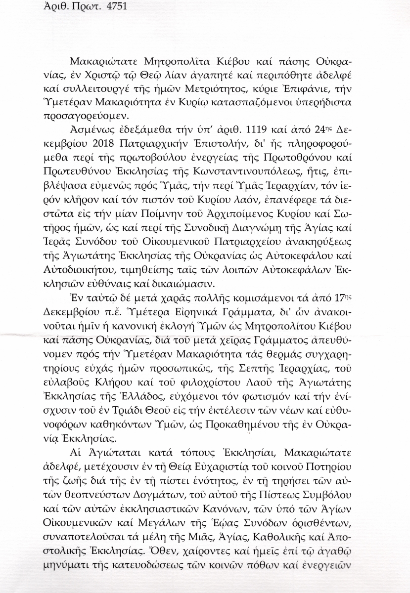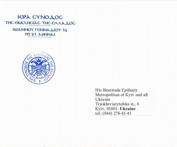 Στα χέρια του μητροπολίτη Κιέβου και πάσης Ουκρανίας κ. Επιφανίου βρίσκεται η επιστολή αναγνώρισης από την Εκκλησία της Ελλάδος.
