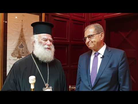 «Θα ήθελα να πω ένα μεγάλο ευχαριστώ στον Υφυπουργό μας, αλλά και φίλο προσωπικό για τη μεγάλη τιμή που μού κάνει να με επισκέπτεται στο δικό μου χώρο, εδώ στην έδρα του Πατριαρχείου για να μού δώσει ευχές και κουράγιο για να συνεχίσω τα ταξίδια της ιεραποστολής στην αχανή Ήπειρο του Μέλλοντος, την Αφρική, αλλά και να έχω δύναμη να κρατώ αυτές τις Θερμοπύλες που μού παρέδωσαν οι πατέρες, οι πρόγονοί μου. Να πω επίσης, ένα μεγάλο ευχαριστώ στην πατρίδα μας την Ελλάδα, και να ξέρει ο Υπουργός μας ότι ο Ελληνισμός ζει και θα ζει σε αυτά εδώ τα ευλογημένα μέρη της Αιγύπτου».