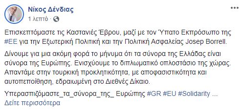 Σε ανάρτησή του για την επίσκεψη στον Έβρο ο κ. Δένδιας, αναφέρει: