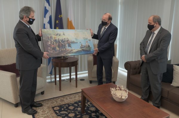 Ο Υπουργός Άμυνας της Κύπρου κ. Χαράλαμπος Πετρίδης, με αφορμή την επέτειο των 200 ετών από την έναρξη της Ελληνικής Επανάστασης, υποδέχθηκε σήμερα στο γραφείο του τον πρέσβη της Ελλάδας στην Κύπρο κ. Θεοχάρη Λαλάκο και του παραχώρησε αντίγραφο του ιστορικού πίνακα του Γιώργου Μαυρογένη: «Το 1821 και η Κύπρος – Κανάρης».
