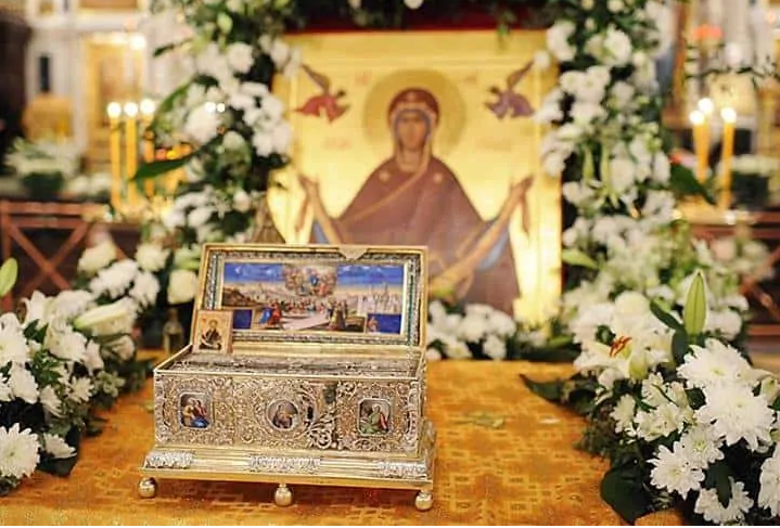 Θεοτόκε ἀειπάρθενε, τῶν ἀνθρώπων ἡ σκέπη, Ἐσθῆτα καὶ Zώνην τοῦ ἀχράντου σου σώματος, κραταιὰν τῇ πόλει σου περιβολὴν ἐδωρήσω, τῷ ἀσπόρῳ τόκῳ σου ἄφθαρτα διαμείναντα, ἐπὶ σοὶ γὰρ καὶ φύσις καινοτομεῖται καὶ χρόνος, διὸ δυσωποῦμέν σε, εἰρήνην τῇ πολιτείᾳ σου δώρησαι, καὶ ταῖς ψυχαῖς ἡμῶν τὸ μέγα ἔλεος.