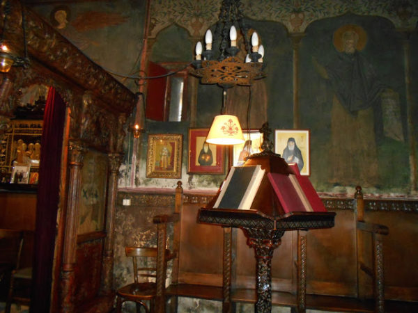 Στον μικρό περίβολο της εκκλησίας υπάρχουν κρήνες και κίονες από την αυθεντική του μορφή.