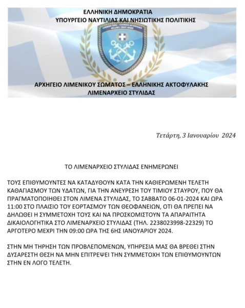 “Το Λιμεναρχείο Στυλίδας ενημερώνει τους επιθυμούντες να καταδυθούν κατά την καθιερωμένη τελετή καθαγιασμού των υδάτων, για την ανεύρεση του Τίμιου Σταυρού, που θα πραγματοποιηθεί στον Λιμένα Στυλίδας, το Σάββατο 06-01-2024 και ώρα 11:00 στο πλαίσιο του εορτασμού των Θεοφανείων, ότι θα πρέπει να δηλωθεί η συμμετοχή τους και να προσκομιστούν τα απαραίτητα δικαιολογητικά στο Λιμεναρχείο Στυλίδας (τηλ. 2238023998-22329) το αργότερο μέχρι τις 09:00 το πρωί του Σαββάτου 6 Ιανουάριου 2024.