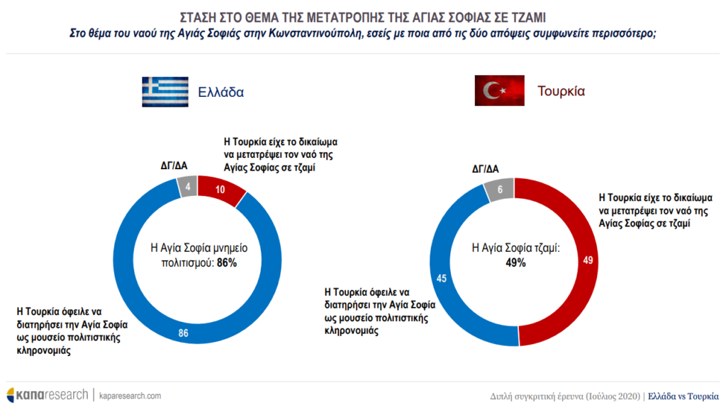 Στην ερώτηση: «Στο θέμα του ναού της Αγιάς Σοφιάς στην Κωνσταντινούπολη, εσείς με ποια από τις δύο απόψεις συμφωνείτε περισσότερο;», η συντριπτική πλειοψηφία (86%) των κατοίκων της Ελλάδας απαντά ότι η Τουρκία έπρεπε να διατηρήσει την Αγιά Σοφιά ως μουσείο. Είναι όμως αξιοσημείωτο ότι το 45% των κατοίκων στην Τουρκία θεωρεί επίσης ότι δεν έπρεπε να μετατραπεί σε τέμενος ο ιστορικός ναός.
