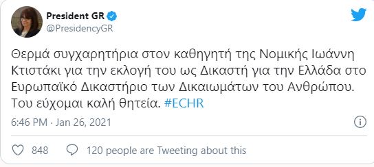 Υπενθυμίζεται ότι: Ο αναπληρωτής καθηγητής στη Νομική Σχολή του Δημοκρίτειου Πανεπιστημίου Θράκης και νομικός Σύμβουλος του Οικουμενικού Πατριαρχείου Γιάννης Κτιστάκις είναι ο νέος Έλληνας δικαστής στο Ευρωπαϊκό Δικαστήριο Ανθρωπίνων Δικαιωμάτων.