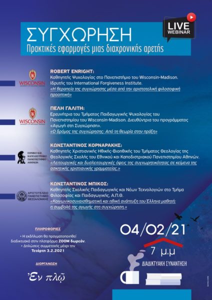 Στο πλαίσιο του προγράμματος «Αγωγή στη Συγχώρηση» οι Εκδόσεις «Εν Πλω» διοργανώνουν την Πέμπτη 4 Φεβρουαρίου 2021 – ώρα 7μμ διαδικτυακή εκδήλωση με θέμα: ΣΥΓΧΩΡΗΣΗ: Πρακτικές εφαρμογές μιας διαχρονικής αρετής.