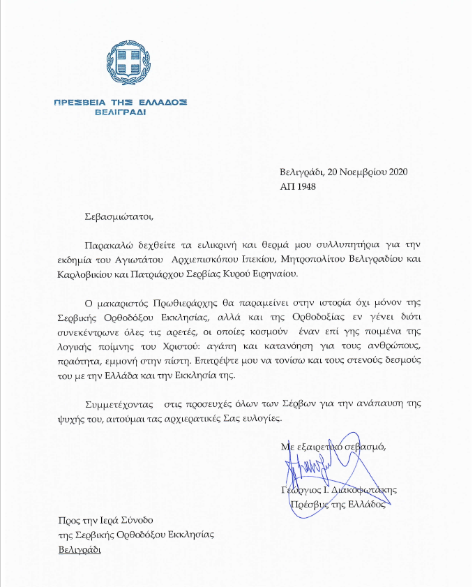 “Παρακαλώ δεχθείτε τα ειλικρινή και θερμά μου συλλυπητήρια για την εκδημία του Αγιωτάτου Αρχιεπισκόπου Πεκίου, Μητροπολίτου Βελιγραδίου και Καρλοβικίου και Πατριάρχου Σερβίας Κυρού Ειρηναίου.