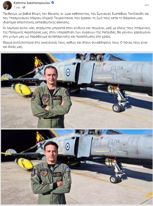 «Πενθούμε, με βαθιά θλίψη, τον θάνατο, εν ώρα καθήκοντος, του Σμηναγού Ευστάθιου Τσιτλακίδη και του Υποσμηναγού Μάριου-Μιχαήλ Τουρούτσικα, που έχασαν τη ζωή τους κατά τη διάρκεια μιας ιδιαίτερα απαιτητικής εκπαιδευτικής άσκησης. Οι λαμπροί αυτοί νέοι, ατρόμητοι μπροστά στον κίνδυνο και ταγμένοι, μαζί με όλους τους ιπτάμενους της Πολεμικής Αεροπορίας μας, στην υπεράσπιση των ουρανών της πατρίδας, θα μείνουν χαραγμένοι στη μνήμη μας ως παράδειγμα αυταπάρνησης και προσήλωσης στο χρέος. Θερμά συλλυπητήρια στις οικογένειές τους, καθώς και στους συναδέλφους τους. Ο πόνος τους είναι και δικός μας», αναφέρει το μήνυμα της Προέδρου της Ελληνικής Δημοκρατίας σε μέσο κοινωνικής δικτύωσης.