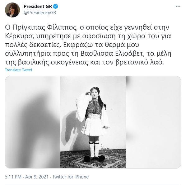 Τα θερμά της συλλυπητήρια προς την Βασίλισσα Ελισάβετ, την βασιλική οικογένεια και τον βρετανικό λαό, για την απώλεια του δούκα του Εδιμβούργου, Πρίγκιπα Φιλίππου, εκφράζει η Πρόεδρος της Δημοκρατίας Κατερίνα Σακελλαροπούλου, μέσω ανάρτησης της σε μέσο κοινωνικής δικτύωσης, κάνοντας παράλληλα αναφορά στην Κέρκυρα, γενέτειρα του θανόντος.