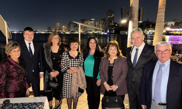 Ο Μάξιμος Χαρακόπουλος, ο Αθανάσιος Μπούρας, ο Ιωάννης Βουλπέσκου μαζί με τις κόπτριες βουλευτίνες του Αιγυπτιακού Κοινοβουλίου κυρίες Manal Halal, Mervat Michael, Nada Alfi, Hanaa Anis και το μέλος της Γερουσίας κα Heba Sharoubin.