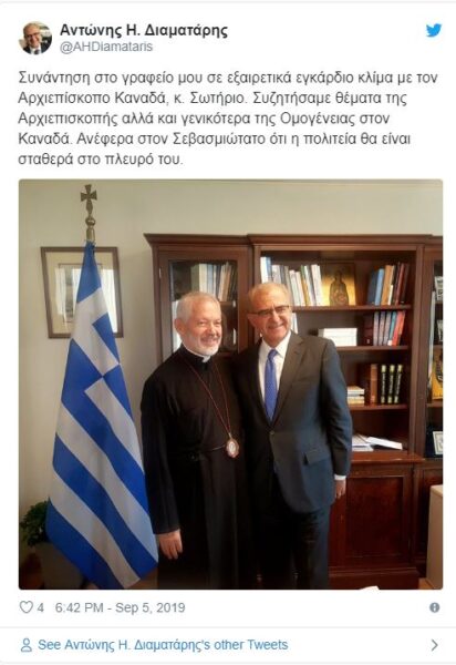 “Συζητήσαμε θέματα της Αρχιεπισκοπής αλλά και γενικότερα της Ομογένειας στον Καναδά. Ανέφερα στον Σεβασμιώτατο ότι η πολιτεία θα είναι σταθερά στο πλευρό του” ανέφερε χαρακτηριστικά μετά τη συνάντηση ο κ. Διαματάρης στο λογαριασμό του σε μέσο κοινωνικής δικτύωσης (twitter):