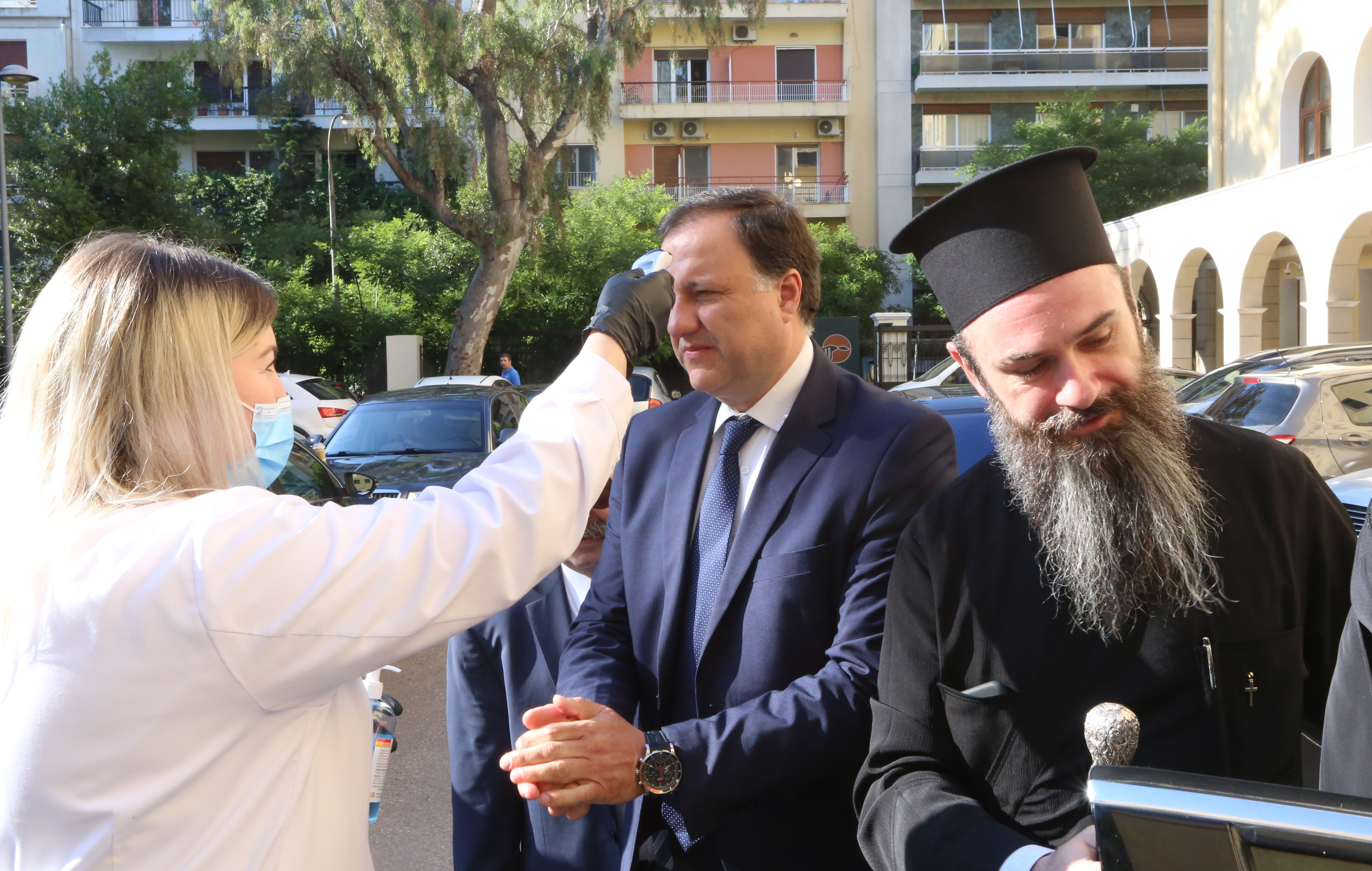 Τον υπουργό υποδέχθηκε στην είσοδο ο π. Νικόδημος Φαρμάκης Γεν. Διευθ. ΕΚΥΟ
