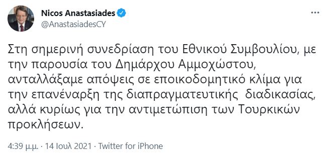 “Στη σημερινή συνεδρίαση του Εθνικού Συμβουλίου, με την παρουσία του Δημάρχου Αμμοχώστου, ανταλλάξαμε απόψεις σε εποικοδομητικό κλίμα για την επανέναρξη της διαπραγματευτικής διαδικασίας, αλλά κυρίως για την αντιμετώπιση των Τουρκικών προκλήσεων”, ανέφερε στο μήνυμα του.