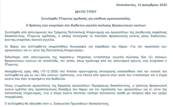 Συνελήφθη από αστυνομικούς του Τμήματος Πολιτιστικής Κληρονομιάς και Αρχαιοτήτων της Διεύθυνσης Ασφάλειας Θεσσαλονίκης, 57χρονος ημεδαπός, ο οποίος επιχείρησε να πουλήσει θρησκευτικές εικόνες μέσω διαδικτύου, έχοντας αναρτήσει σχετική αγγελία.