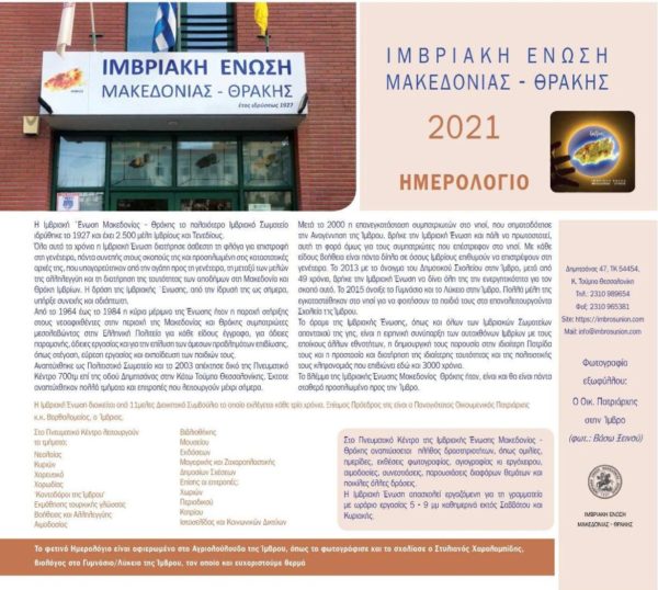 Μπορείτε να το προμηθευτείτε είτε από τα γραφεία της Ιμβριακής Ένωσης είτε με αντικαταβολή στο χώρο σας. Διαστάσεις ημερολογίου 28εκ ορ. 25εκ καθ. σε πολυτελείας χαρτί. Κόστος 5 € .