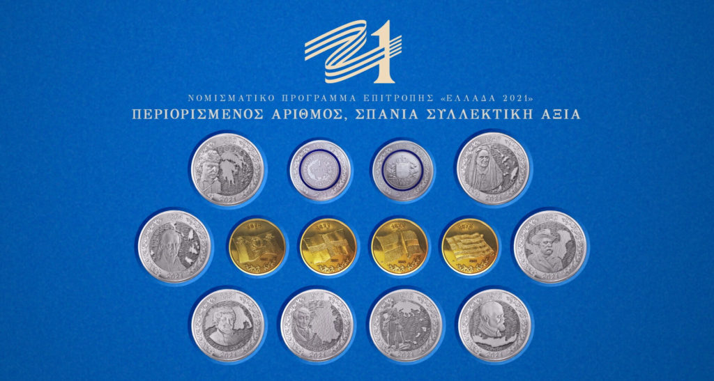 Το Νομισματικό Πρόγραμμα της Επιτροπής “Ελλάδα 2021” υλοποιήθηκε με απόφαση του Υπουργείου Οικονομικών και με την ευγενική χορηγία της Τράπεζας της Ελλάδας, κατόπιν σχετικής εισήγησης της Επιτροπής. Περιλαμβάνει την έκδοση 14 νομισμάτων, σπάνιας συλλεκτικής αξίας, στα οποία οι διεθνώς βραβευμένοι χαράκτες του Ελληνικού Νομισματοκοπείου αποτύπωσαν, με τη μοναδική τους τεχνική, εμβληματικές στιγμές της ιστορίας της σύγχρονης Ελλάδας, με αφορμή την επέτειο των 200 χρόνων μετά την Επανάσταση.