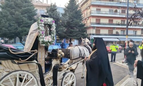 Στη συνέχεια και αφού η άμαξα διέσχισε τους κεντρικούς δρόμους της πόλης, η εικόνα μεταφέρθηκε στο Ναό του Αγίου στην Πλατεία Πάργης ο οποίος είναι το επίκεντρο του εορτασμού.