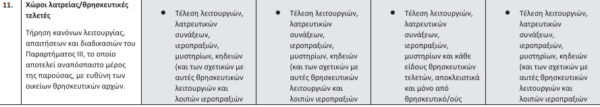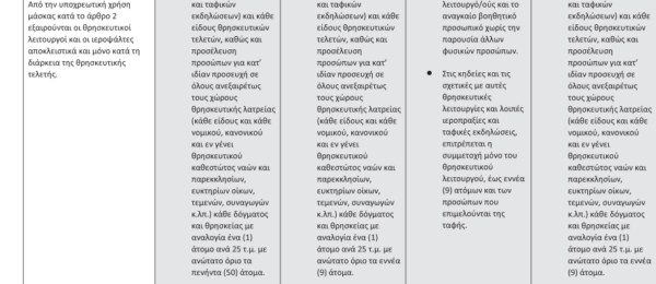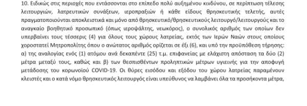 Στο Παράρτημα της ΚΥΑ για τους χώρους λατρείας επισημαίνεται πως στις περιοχές που εντάσσονται στο επίπεδο πολύ αυξημένου κινδύνου ο αριθμός θρησκευτικού λειτουργού και του απαραίτητου βοηθητικού (ιερέας, ψάλτες και νεωκόρος) δεν μπορεί να ξεπερνάει τα 4 άτομα, εκτός των Ιερών Ναών που χοροστατεί Μητροπολίτης όπου ο αριθμός ορίζεται σε 6 άτομα.