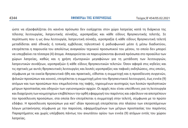 Επίσης, οι θύρες του ναού παραμένουν κλειστές και ο θρησκευτικός λειτουργός είναι υπεύθυνος για την τήρηση των μέτρων. Σε περίπτωση που η λειτουργία μεταδίδεται από τηλεοπτικό ή ραδιοφωνικό μέσο ή μέσω διαδικτύου επιτρέπεται η παρουσία του απαραίτητου προσωπικού που δεν μπορεί να υπερβαίνει τα 4 άτομα.