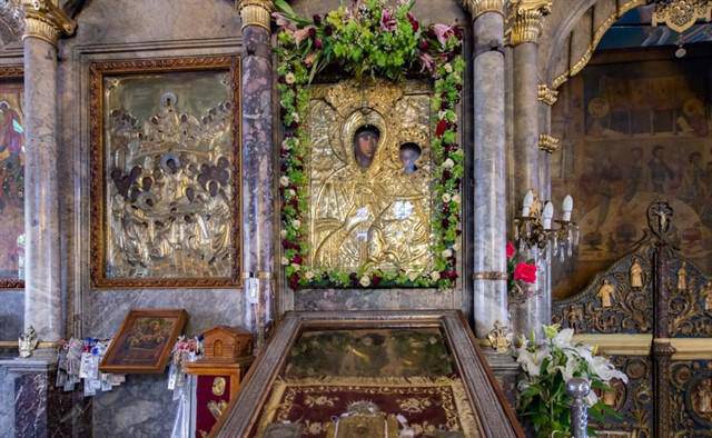 Επί αιώνες, όταν ερχότανε οι Χριστιανοί στο ναό της Παναγίας, έβλεπαν με κατάνυξη στο συνήθη τόπο, δίπλα στην ωραία Πύλη μια ωραία εικόνα της Παναγίας να κρατά στην αγκαλιά της το Χριστό. Όλη η εικόνα ήταν, όπως είναι και σήμερα, ντυμένη με πλάκα επίχρυση, με καλλιτεχνικά σχέδια και πολύτιμα πετράδια, πού λάμπουν στο φως των κανδηλιών.