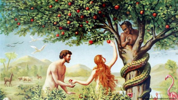Προτού εμφανιστεί το φίδι στον παράδεισο του Θεού ζούσαν ειρηνικά και αθώα ο Αδάμ και η Εύα. Λιοντάρια, λύκοι και άλλα ζώα επιδίδονταν στη χορτοφαγία και δεν ενοχλούσαν κανέναν. Ο Θεός στους πρωτόπλαστους έδωσε κάθε ελευθερία, εκτός από μια ρητή απαγόρευση: να μην φάνε τον καρπό από το δέντρο της γνώσης. Όταν το φίδι έπεισε την Εύα να δοκιμάσει ένα από τα μήλα αυτού του δέντρου τότε, σύμφωνα με τη Βίβλο, ο Θεός τους τιμώρησε διώχνοντας τους από την Εδέμ. Αυτό ήταν το προπατορικό αμάρτημα. Το φίδι έχασε την ικανότητα του να μιλάει και μπορούσε μόνο να σέρνεται στον κόσμο.