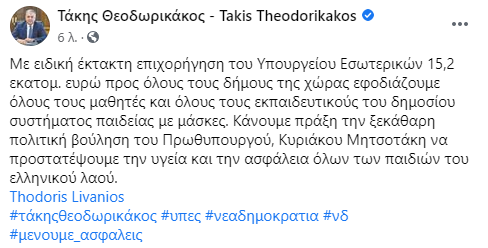 “Με ειδική έκτακτη επιχορήγηση του Υπουργείου Εσωτερικών 15,2 εκατομ. ευρώ προς όλους τους δήμους της χώρας εφοδιάζουμε όλους τους μαθητές και όλους τους εκπαιδευτικούς του δημοσίου συστήματος παιδείας με μάσκες. Κάνουμε πράξη την ξεκάθαρη πολιτική βούληση του Πρωθυπουργού, Κυριάκου Μητσοτάκη να προστατέψουμε την υγεία και την ασφάλεια όλων των παιδιών του ελληνικού λαού”, έγραψε στον προσωπικό του λογαριασμό στο facebook ο κ. Θεοδωρικάκος.