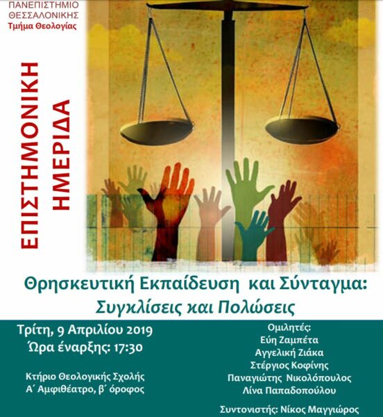 Σήμερα, Τρίτη, 9 Απριλίου 2019 και ώρα 17.30, πραγματοποιείται Επιστημονική Ημερίδα στο Κτίριο της Θεολογικής Σχολής Αριστοτελείου Πανεπιστημίου Θεσσαλονίκης υπό το θέμα “Θρησκευτική Εκπαίδευση και Σύνταγμα: Συγκλίσεις και Πολώσεις”.