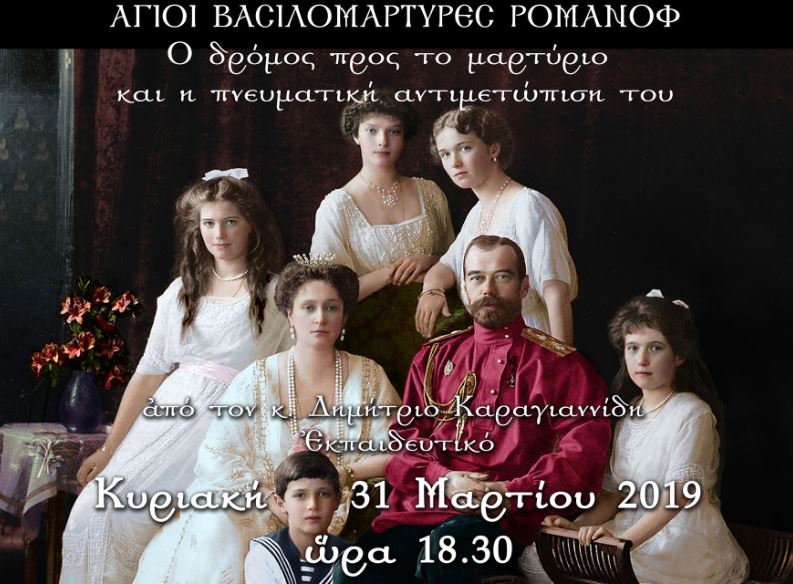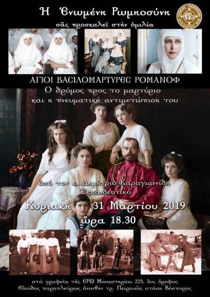 Ἡ Ἑνωμένη Ρωμηοσύνη, μάς προσκαλεῖ τήν Κυριακή 31 Μαρτίου 2019 στις 18.30 στήν ὁμιλία Ἅγιοι Βασιλομάρτυρες Ρομάνοφ “Ὁ δρόμος πρός τό μαρτύριο καί ἡ πνευματική ἀντιμετώπισή του” ἀπό τόν κ. Δημήτριο Καραγιαννίδη, Ἐκπαιδευτικό, στά γραφεῖα τῆς ΕΡΩ, Μοναστηρίου 225, Μενεμένη, Θεσααλονίκη, 3ος ὄροφος. Εἴσοδος παραπλεύρως ἄνωθεν τρ. Πειραιῶς, στάση Βόσπορος.