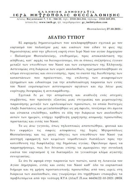 Εξ αφορμής δημοσιευμάτων που κυκλοφόρησαν σχετικά με τον εορτασμό του πολιούχου Αγίου Δημητρίου και εικόνων που είδαν το φως της δημοσιότητας από την χθεσινή εορτή στον Ιερό Ναό του αγίου Δημητρίου – Πολιούχου Θεσσαλονίκης, η Ιερά Μητρόπολη Θεσσαλονίκης, προς αποκατάσταση της αλήθειας, διευκρινίζει με επίσημη ανακοίνωσή της, ότι οι όποιες συζητήσεις έγιναν μεταξύ των υπευθύνων του Ναού και των εκπροσώπων της Ελληνικής Αστυνομίας στη διάρκεια των ιερών ακολουθιών, πραγματοποιήθηκαν σε κλίμα συνεργασίας και συνεννόησης.