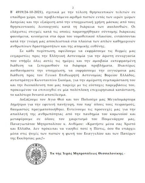 Σε ότι δε αφορά στην παρουσία των πιστών, κατά τη Λιτανεία του Αγίου Δημητρίου, εντός και εκτός του Ναού καθ΄ όλο το εορταστικό διήμερο και τη χρήση προστατευτικής προσωπίδας από τους ιερείς στη διάρκεια των ακολουθιών, η Ιερά Μητρόπολη ενημερώνει ότι τηρήθηκαν επακριβώς τα προβλεπόμενα από την νεότερη ΚΥΑ (Δ1α/Γ.Π.οικ 66436/22-10-2021 (ΦΕΚ Β΄ 4919/24-10-2021), σχετικά με την τέλεση θρησκευτικών τελετών σε υπαίθριο χώρο, τον προβλεπόμενο αριθμό πιστών εντός των ιερών χώρων λατρείας και την εξαίρεση από την υποχρεωτική χρήση μάσκας από τους θρησκευτικούς λειτουργούς κατά τη διάρκεια των ακολουθιών.