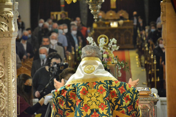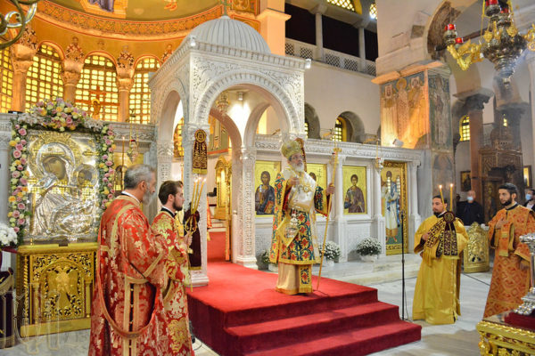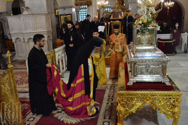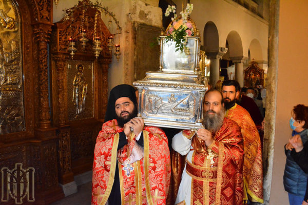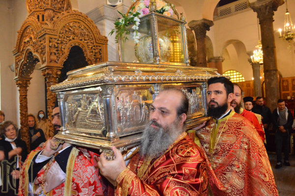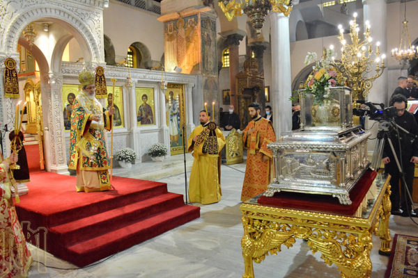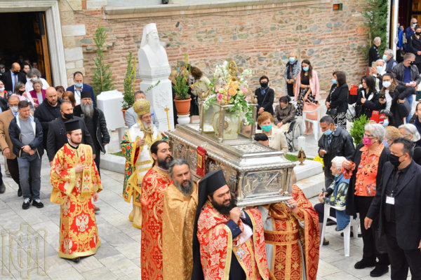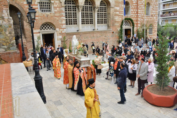 Μετά το πέρας της Θείας Λειτουργίας ακολούθησε έξοδος των ιερών και χαριτοβρύτων λειψάνων του Μεγαλομάρτυρος και πολιούχου αγίου Δημητρίου στο προαύλειο του Ναού, προς παρηγορία και παραμυθία των πιστών, καθώς λόγω των γνωστών υγειονομικών μέτρων, ήταν περιορισμένος ο αριθμός των εκκλησιαζομένων πιστών, ενώ ως γνωστόν έχει απαγορευθεί η δυνατότητα τέλεσης λατρευτικής δραστηριότητας εν πομπή και ως εκ τούτου δεν κατέστη δυνατόν να πραγματοποιηθεί η από αιώνων καθιερωμένη πάνδημος λιτανεία διά μέσου των οδών της πόλεως.
